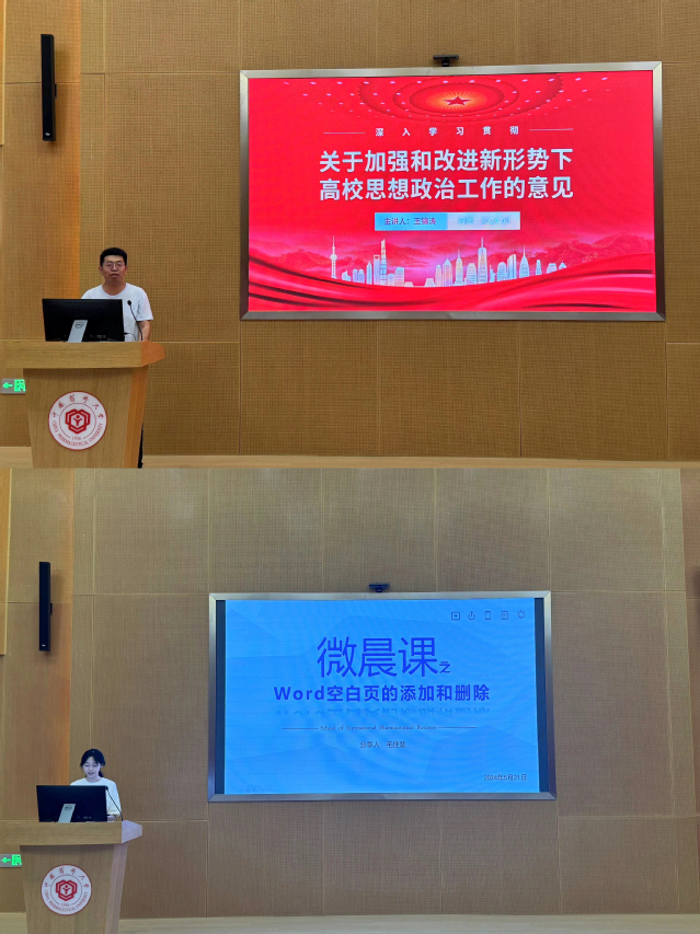 本次“微晨课”由辅导员王锦涛老师主讲,深入解读了《关于加强和改进新形势下高校思想政治工作的意见》。他紧扣文件出台的重要意义和总体要求,围绕“如何加强思想理论教育和价值引领,怎样更好地发挥哲学社会科学的育人功能,如何推动高校思想政治工作的改革创新,如何加强和改善党对高校的领导”这几个问题,生动阐述了新形势下改进高校思想政治工作的意义和重要性,并结合学院的专业特色强调加强哲学社会科学学科体系建设,切实发挥其在育人中的重要作用。接着,学生助理毛佳慧开展“技能加油站”Word相关操作技巧分享,以进一步提升辅导员与学生助理的工作技能。
