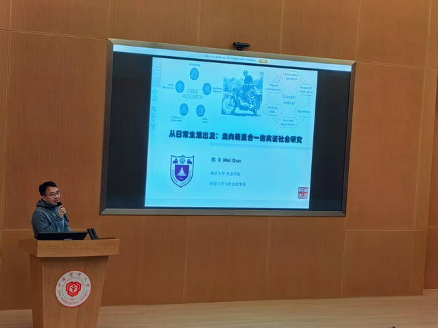 南京大学社会学院副院长郭未教授以“从日常生活出发:走向表里合一的实证社会研究”为题,从人口社会学、人口经济学和社会工作交叉学科视角,结合自身的科学研究经历,为在场师生深入浅出地剖析了系列学术热点问题,以深厚的理论与前沿的方法助力洞察社会现象与社会事实背后的复杂机制。他以广阔意义上的“自己”为方法,落脚于实证社会研究,引领师生从事物的表象走向研究的本质,呈现出从微观个体与宏观结构的交汇特征,并由此出发,由表及里、由此及彼,发展出表里合一的实证社会研究。他鼓励在场师生,只有在社会科学研究中置入“自我”与“他者”的情愫,才能在学术旅程中永葆热爱,在与时代共鸣中,为创造健康社会贡献社会科学学者的有生力量。