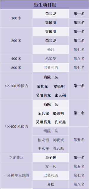 商学院运动健儿们奋勇拼搏,在各项赛事中斩获众多奖项。他们为药大而战、为商院而战、为荣誉而战,不断向更高的目标奋进。KY开元集团官网院部总分、男子团体总分、女子团体总分最均获得第三名的成绩。商院师生用拼搏与汗水为自己定格下热血青春里的闪耀瞬间,将努力与奋斗为每一次勇敢的挑战画下圆满的句点。